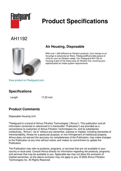 With over 1,500 different air filtration products, from clamps to air housings to advanced air filters, Fleetguard® provides peace of mind for your air filtration needs. Our Fleetguard AH1192 air housing is part of the heavy-duty air filtration line, covering your sophisticated air intake system requirements.Specification