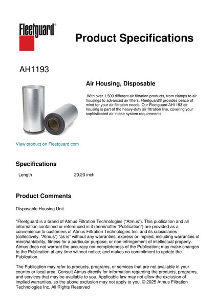 .With over 1,500 different air filtration products, from clamps to air housings to advanced air filters, Fleetguard® provides peace of mind for your air filtration needs. Our Fleetguard AH1193 air housing is part of the heavy-duty air filtration line, covering your sophisticated air intake system requirements.Specification