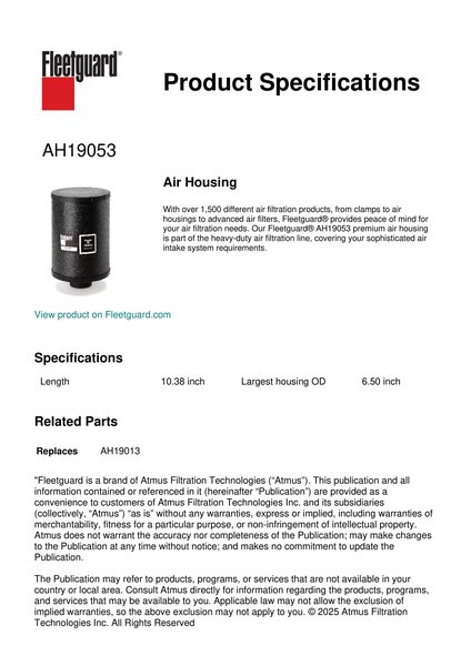 With over 1,500 different air filtration products, from clamps to air housings to advanced air filters, Fleetguard® provides peace of mind for your air filtration needs. Our Fleetguard® AH19053 premium air housing is part of the heavy-duty air filtration line, covering your sophisticated air intake system requirements.Specification