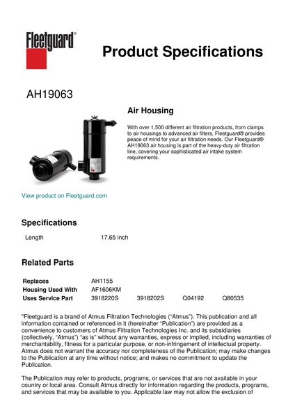 With over 1,500 different air filtration products, from clamps to air housings to advanced air filters, Fleetguard® provides peace of mind for your air filtration needs. Our Fleetguard® AH19063 air housing is part of the heavy-duty air filtration line, covering your sophisticated air intake system requirements.Specification
