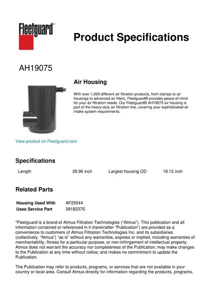 With over 1,500 different air filtration products, from clamps to air housings to advanced air filters, Fleetguard® provides peace of mind for your air filtration needs. Our Fleetguard® AH19075 air housing is part of the heavy-duty air filtration line, covering your sophisticated air intake system requirements.Specification