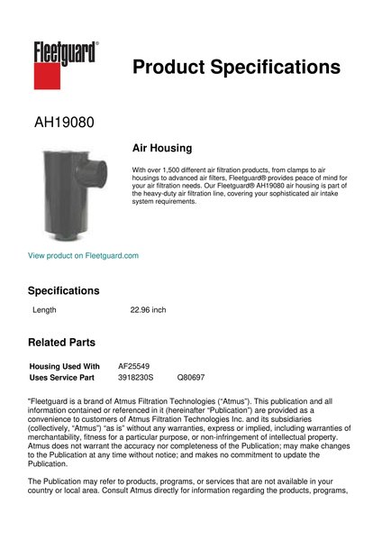 With over 1,500 different air filtration products, from clamps to air housings to advanced air filters, Fleetguard® provides peace of mind for your air filtration needs. Our Fleetguard® AH19080 air housing is part of the heavy-duty air filtration line, covering your sophisticated air intake system requirements.Specification
