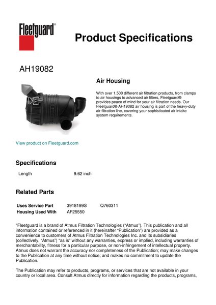 With over 1,500 different air filtration products, from clamps to air housings to advanced air filters, Fleetguard® provides peace of mind for your air filtration needs. Our Fleetguard® AH19082 air housing is part of the heavy-duty air filtration line, covering your sophisticated air intake system requirements.Specification