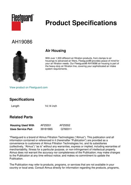 With over 1,500 different air filtration products, from clamps to air housings to advanced air filters, Fleetguard® provides peace of mind for your air filtration needs. Our Fleetguard® AH19086 air housing is part of the heavy-duty air filtration line, covering your sophisticated air intake system requirements.Specification