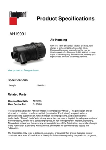 With over 1,500 different air filtration products, from clamps to air housings to advanced air filters, Fleetguard® provides peace of mind for your air filtration needs. Our Fleetguard® AH19091 air housing is part of the heavy-duty air filtration line, covering your sophisticated air intake system requirements.Specification