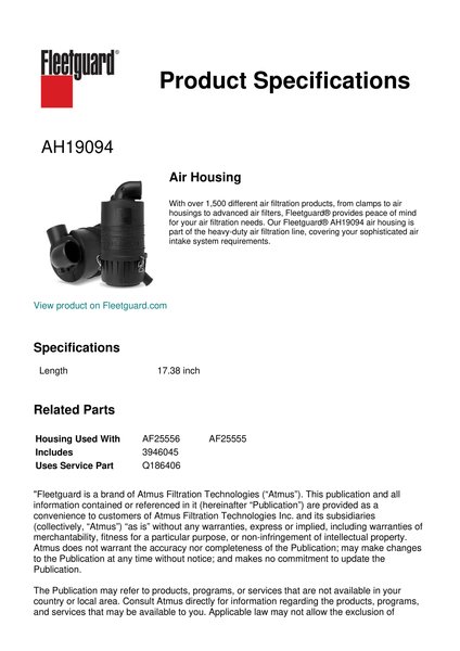 With over 1,500 different air filtration products, from clamps to air housings to advanced air filters, Fleetguard® provides peace of mind for your air filtration needs. Our Fleetguard® AH19094 air housing is part of the heavy-duty air filtration line, covering your sophisticated air intake system requirements.Specification