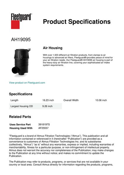 With over 1,500 different air filtration products, from clamps to air housings to advanced air filters, Fleetguard® provides peace of mind for your air filtration needs. Our Fleetguard® AH19095 air housing is part of the heavy-duty air filtration line, covering your sophisticated air intake system requirements.Specification