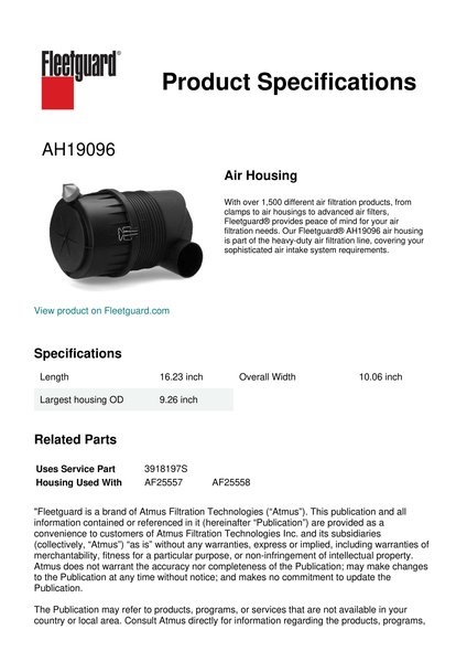 With over 1,500 different air filtration products, from clamps to air housings to advanced air filters, Fleetguard® provides peace of mind for your air filtration needs. Our Fleetguard® AH19096 air housing is part of the heavy-duty air filtration line, covering your sophisticated air intake system requirements.Specification