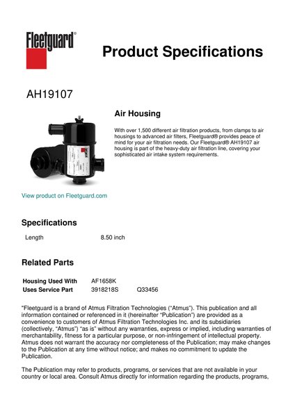 With over 1,500 different air filtration products, from clamps to air housings to advanced air filters, Fleetguard® provides peace of mind for your air filtration needs. Our Fleetguard® AH19107 air housing is part of the heavy-duty air filtration line, covering your sophisticated air intake system requirements.Specification