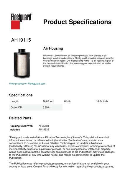 With over 1,500 different air filtration products, from clamps to air housings to advanced air filters, Fleetguard® provides peace of mind for your air filtration needs. Our Fleetguard® AH19115 air housing is part of the heavy-duty air filtration line, covering your sophisticated air intake system requirements.Specification