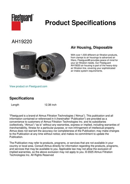With over 1,500 different air filtration products, from clamps to air housings to advanced air filters, Fleetguard® provides peace of mind for your air filtration needs. Our Fleetguard AH19220 air housing is part of the heavy-duty air filtration line, covering your sophisticated air intake system requirements.Specification