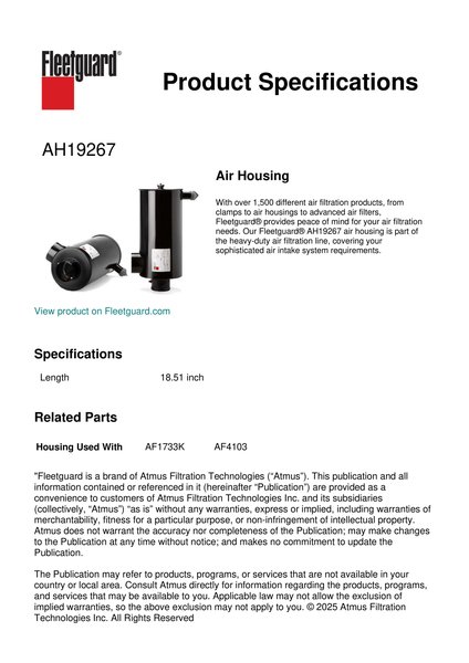 With over 1,500 different air filtration products, from clamps to air housings to advanced air filters, Fleetguard® provides peace of mind for your air filtration needs. Our Fleetguard® AH19267 air housing is part of the heavy-duty air filtration line, covering your sophisticated air intake system requirements.Specification