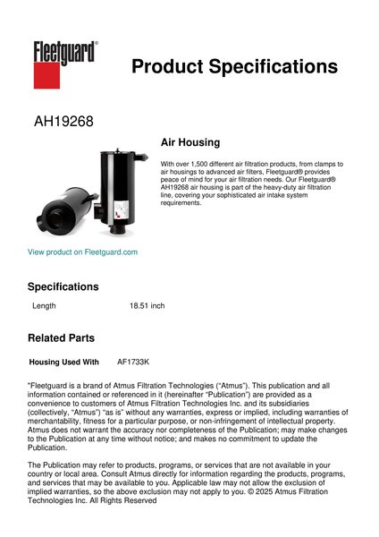 With over 1,500 different air filtration products, from clamps to air housings to advanced air filters, Fleetguard® provides peace of mind for your air filtration needs. Our Fleetguard® AH19268 air housing is part of the heavy-duty air filtration line, covering your sophisticated air intake system requirements.Specification
