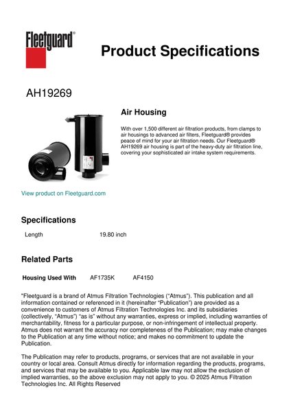 With over 1,500 different air filtration products, from clamps to air housings to advanced air filters, Fleetguard® provides peace of mind for your air filtration needs. Our Fleetguard® AH19269 air housing is part of the heavy-duty air filtration line, covering your sophisticated air intake system requirements.Specification