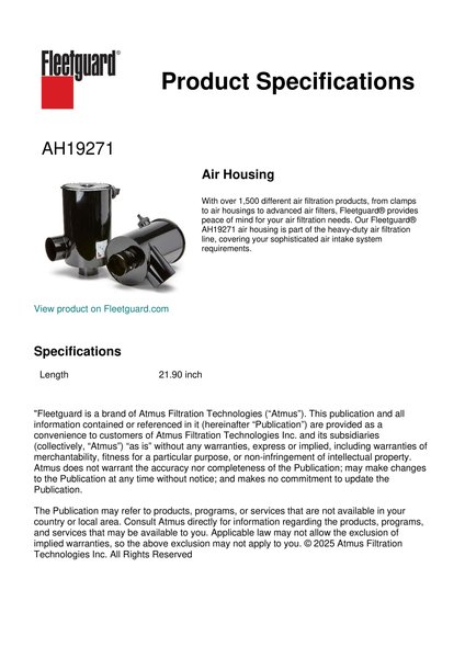 With over 1,500 different air filtration products, from clamps to air housings to advanced air filters, Fleetguard® provides peace of mind for your air filtration needs. Our Fleetguard® AH19271 air housing is part of the heavy-duty air filtration line, covering your sophisticated air intake system requirements.Specification