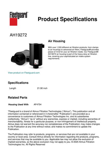With over 1,500 different air filtration products, from clamps to air housings to advanced air filters, Fleetguard® provides peace of mind for your air filtration needs. Our Fleetguard® AH19272 air housing is part of the heavy-duty air filtration line, covering your sophisticated air intake system requirements.Specification
