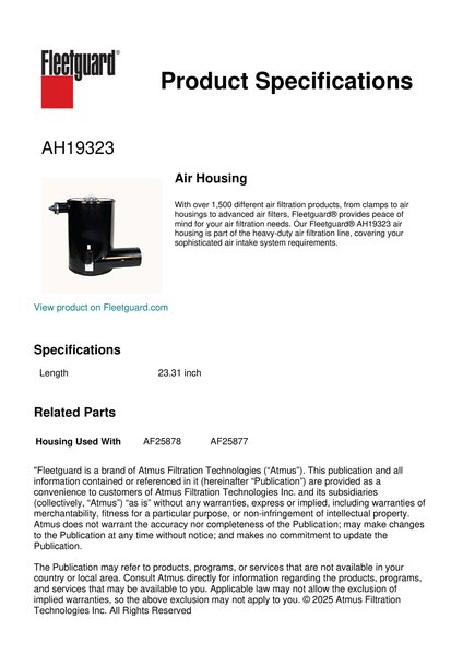 With over 1,500 different air filtration products, from clamps to air housings to advanced air filters, Fleetguard® provides peace of mind for your air filtration needs. Our Fleetguard® AH19323 air housing is part of the heavy-duty air filtration line, covering your sophisticated air intake system requirements.Specification