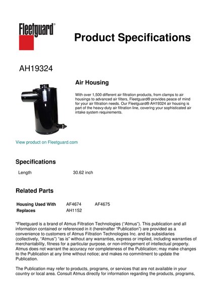 With over 1,500 different air filtration products, from clamps to air housings to advanced air filters, Fleetguard® provides peace of mind for your air filtration needs. Our Fleetguard® AH19324 air housing is part of the heavy-duty air filtration line, covering your sophisticated air intake system requirements.Specification
