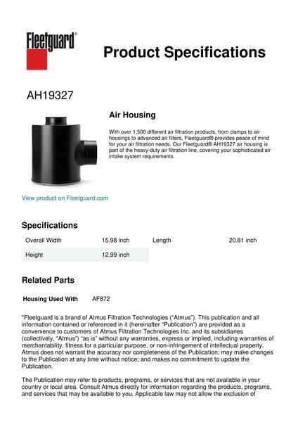 With over 1,500 different air filtration products, from clamps to air housings to advanced air filters, Fleetguard® provides peace of mind for your air filtration needs. Our Fleetguard® AH19327 air housing is part of the heavy-duty air filtration line, covering your sophisticated air intake system requirements.Specification