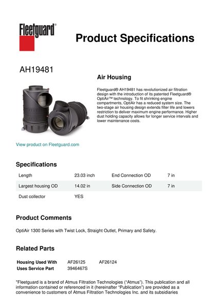 Fleetguard® AH19481 has revolutionized air filtration design with the introduction of its patented Fleetguard® OptiAir™ technology. To fit shrinking engine compartments, OptiAir has a reduced system size. The two-stage air housing design extends filter life and lowers restriction to deliver maximum engine performance. Higher dust holding capacity allows for longer service intervals and lower maintenance costs.Specification