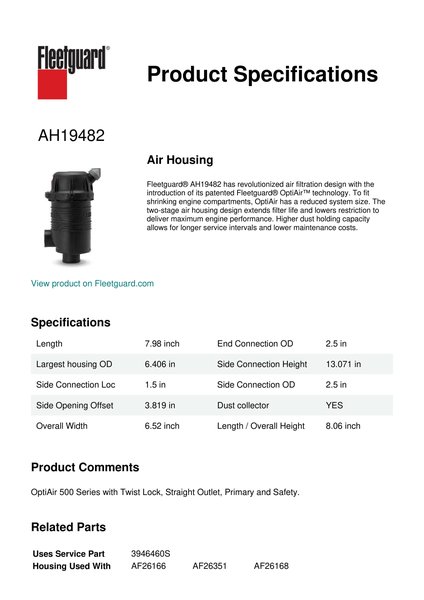 Fleetguard® AH19482 has revolutionized air filtration design with the introduction of its patented Fleetguard® OptiAir™ technology. To fit shrinking engine compartments, OptiAir has a reduced system size. The two-stage air housing design extends filter life and lowers restriction to deliver maximum engine performance. Higher dust holding capacity allows for longer service intervals and lower maintenance costs.Specification
