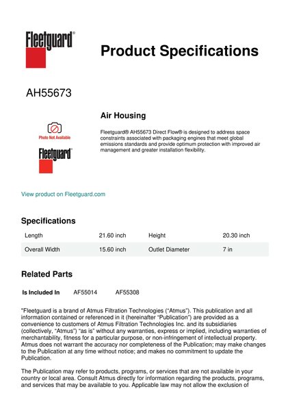 Fleetguard® AH55673 Direct Flow® is designed to address space constraints associated with packaging engines that meet global emissions standards and provide optimum protection with improved air management and greater installation flexibility.Specification
