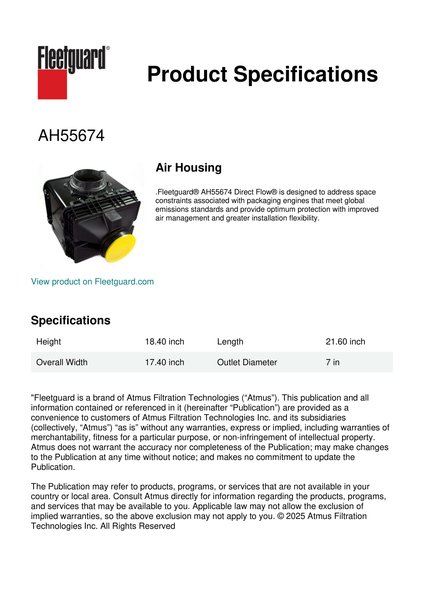 .Fleetguard® AH55674 Direct Flow® is designed to address space constraints associated with packaging engines that meet global emissions standards and provide optimum protection with improved air management and greater installation flexibility.Specification