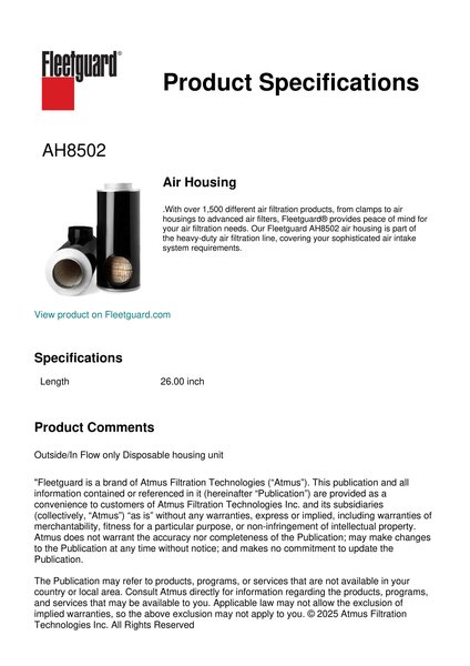 .With over 1,500 different air filtration products, from clamps to air housings to advanced air filters, Fleetguard® provides peace of mind for your air filtration needs. Our Fleetguard AH8502 air housing is part of the heavy-duty air filtration line, covering your sophisticated air intake system requirements.Specification