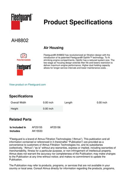 Fleetguard® AH8802 has revolutionized air filtration design with the introduction of its patented Fleetguard® OptiAir™ technology. To fit shrinking engine compartments, OptiAir has a reduced system size. The two-stage air housing design extends filter life and lowers restriction to deliver maximum engine performance. Higher dust holding capacity allows for longer service intervals and lower maintenance costs. .Specification