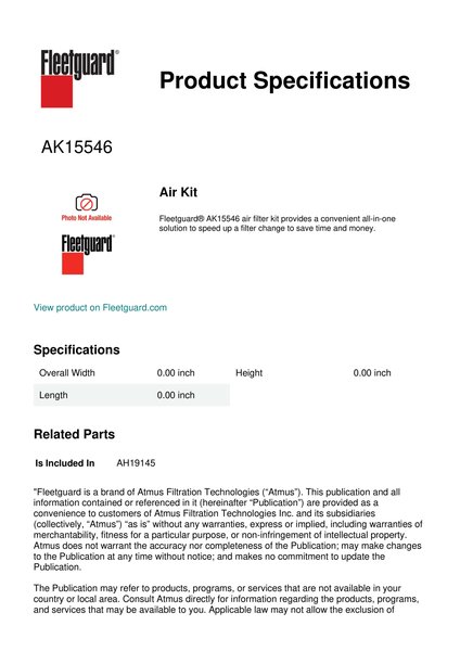 Fleetguard® AK15546 air filter kit provides a convenient all-in-one solution to speed up a filter change to save time and money.Specification