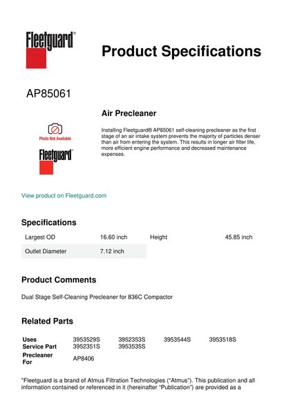 Installing Fleetguard® AP85061 self-cleaning precleaner as the first stage of an air intake system prevents the majority of particles denser than air from entering the system. This results in longer air filter life, more efficient engine performance and decreased maintenance expenses.Specification