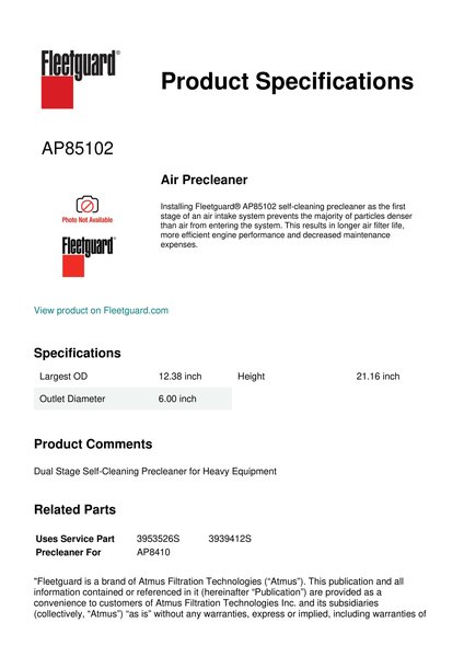 Installing Fleetguard® AP85102 self-cleaning precleaner as the first stage of an air intake system prevents the majority of particles denser than air from entering the system. This results in longer air filter life, more efficient engine performance and decreased maintenance expenses.Specification