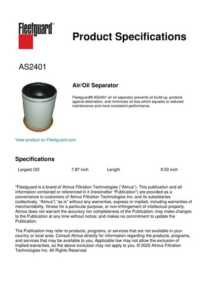 Fleetguard® AS2401 air oil separator prevents oil build-up, protects against detonation, and minimizes oil loss which equates to reduced maintenance and more consistent performance.Specification