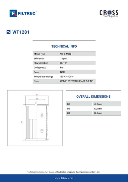 Genuine Filtrec WT1281. This Filtrec element is designed to meet or exceed the quality and performance of brand OEM’s ensuring superior filtration performance and long-lasting durability.