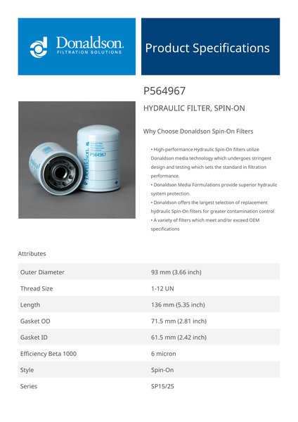 Genuine Donaldson P564967 Hydraulic Filter, Spin-On provides dependable protection for hydraulic systems by efficiently removing particulates and contaminants. It ensures clean hydraulic fluid, promoting smooth operation and extending the lifespan of critical system components.With its easy-to-install spin-on design, this filter minimizes downtime and maintenance costs. Its durable construction and advanced filtration media make it a trusted choice for industrial and mobile hydraulic applications requiring reliable performance.