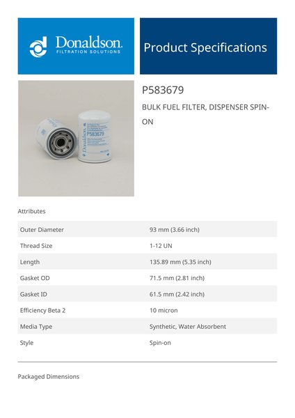 Genuine Donaldson P583679 Bulk Fuel Filter, Dispenser Spin-On is engineered to deliver reliable performance and durability across a wide range of applications. Designed with high-quality materials, it ensures consistent functionality while meeting demanding operational requirements.