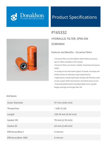 Genuine Donaldson P165332 Hydraulic Filter, Spin-On Duramax combines the convenience of a spin-on filter with the robust durability of Donaldson’s Duramax line. It offers high-efficiency filtration, effectively removing contaminants while withstanding high-pressure environments.