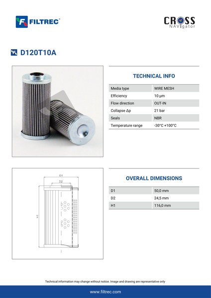 Genuine Filtrec D120T10A. This Filtrec element is designed to meet or exceed the quality and performance of brand OEM’s ensuring superior filtration performance and long-lasting durability.