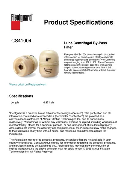 Fleetguard® CS41004 uses the drop-in disposable rotor solution for centrifuges in Fleetguard remote centrifuge housings and Eliminators™ on Cummins engines ranging from 19L to 95L. These Fleetguard rotors replace the current assembly with a single drop-in option, reducing service time from 1.5-2 hours to approximately 20 minutes without the need for any special tools.Specification