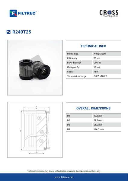 Filtrec R240T25 Replaces the MP Filtri CU200M25N