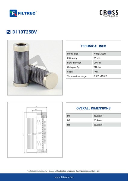 Engineered with their high performance media and a durable design, the D110T25BV provides reliable and consistent performance over its lifespan, even in harsh operating environments. When you order from FilterFinder, you can trust that you are getting a reliable and high-quality replacement filter that will keep your system running smoothly.