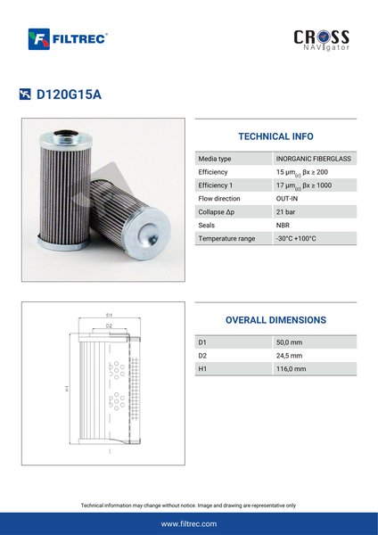 Genuine Filtrec D120G15A. This Filtrec element is designed to meet or exceed the quality and performance of brand OEM’s ensuring superior filtration performance and long-lasting durability.