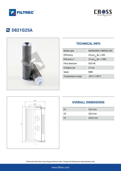 Genuine Filtrec D821G25A. This Filtrec element is designed to meet or exceed the quality and performance of brand OEM’s ensuring superior filtration performance and long-lasting durability.