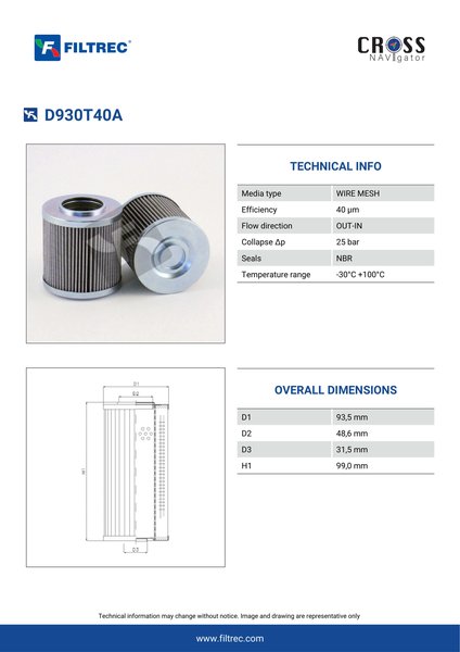 Genuine Filtrec D930T40A. This Filtrec element is designed to meet or exceed the quality and performance of brand OEM’s ensuring superior filtration performance and long-lasting durability.