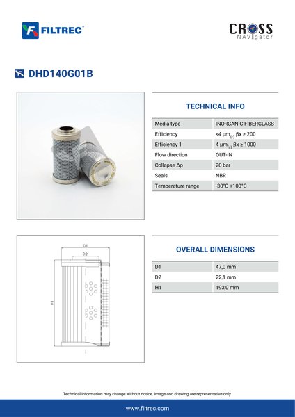 Engineered with their high performance media and a durable design, the DHD140G01B provides reliable and consistent performance over its lifespan, even in harsh operating environments. When you order from FilterFinder, you can trust that you are getting a reliable and high-quality replacement filter that will keep your system running smoothly.