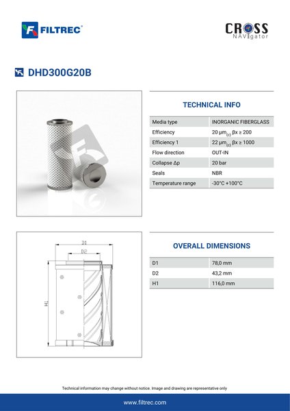 Genuine Filtrec DHD300G20B. This Filtrec element is designed to meet or exceed the quality and performance of brand OEM’s ensuring superior filtration performance and long-lasting durability.Engineered with their high performance media and a durable design, the DHD300G20B provides reliable and consistent performance over its lifespan, even in harsh operating environments. When you order from FilterFinder, you can trust that you are getting a reliable and high-quality replacement filter that will keep your system running smoothly.