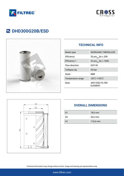 Genuine Filtrec DHD300G20B/ESD. This Filtrec element is designed to meet or exceed the quality and performance of brand OEM’s ensuring superior filtration performance and long-lasting durability.Engineered with their high performance media and a durable design, the DHD300G20B/ESD provides reliable and consistent performance over its lifespan, even in harsh operating environments. When you order from FilterFinder, you can trust that you are getting a reliable and high-quality replacement filter that will keep your system running smoothly.