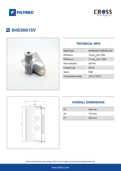 Genuine Filtrec DHD30G15V. This Filtrec element is designed to meet or exceed the quality and performance of brand OEM’s ensuring superior filtration performance and long-lasting durability.Engineered with their high performance media and a durable design, the DHD30G15V provides reliable and consistent performance over its lifespan, even in harsh operating environments. When you order from FilterFinder, you can trust that you are getting a reliable and high-quality replacement filter that will keep your system running smoothly.