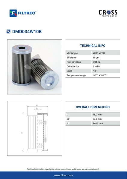 Genuine Filtrec DMD034W10B. This Filtrec element is designed to meet or exceed the quality and performance of brand OEM’s ensuring superior filtration performance and long-lasting durability.