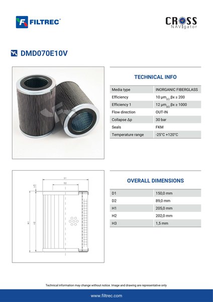 Engineered with their high performance media and a durable design, the DMD070E10V provides reliable and consistent performance over its lifespan, even in harsh operating environments. When you order from FilterFinder, you can trust that you are getting a reliable and high-quality replacement filter that will keep your system running smoothly.